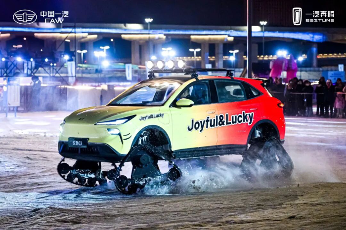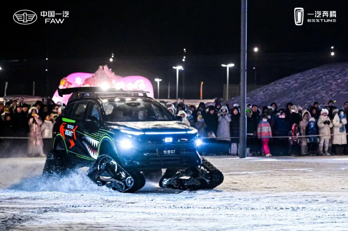 活動(dòng)現(xiàn)場(chǎng)氛圍火熱,近千名各地嘉賓齊聚肆季南河,共赴冰雪與汽車交融盛宴。一汽奔騰三款改裝車動(dòng)感登場(chǎng),一汽奔騰小馬“蟹行版”秀出橫向行駛、神龍擺尾、原地360度旋轉(zhuǎn)等操作,盡顯萌趣與靈活;一汽奔騰悅意03與悅意07“履帶版”同步聯(lián)動(dòng),在冰雪彎道靈活馳騁、穩(wěn)健過彎,流暢操控、扎實(shí)底盤與澎湃動(dòng)力彰顯大廠品質(zhì)。