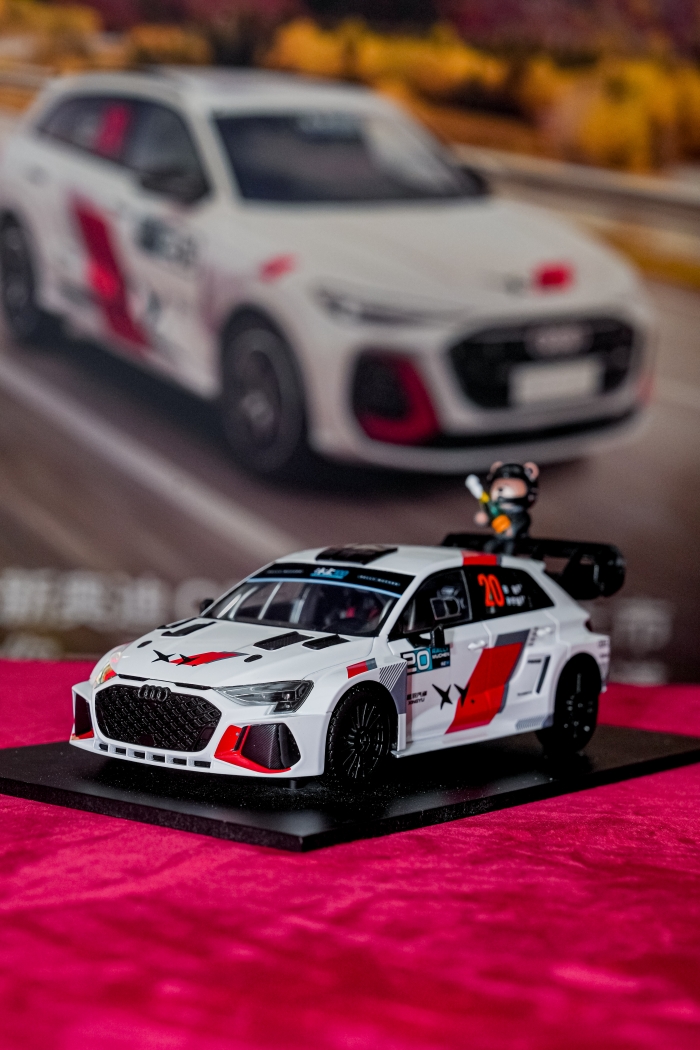 身披Audi Sport經(jīng)典紅黑灰涂裝的賽車外觀,將奧迪品牌的賽道基因呈現(xiàn)在大銀幕之上