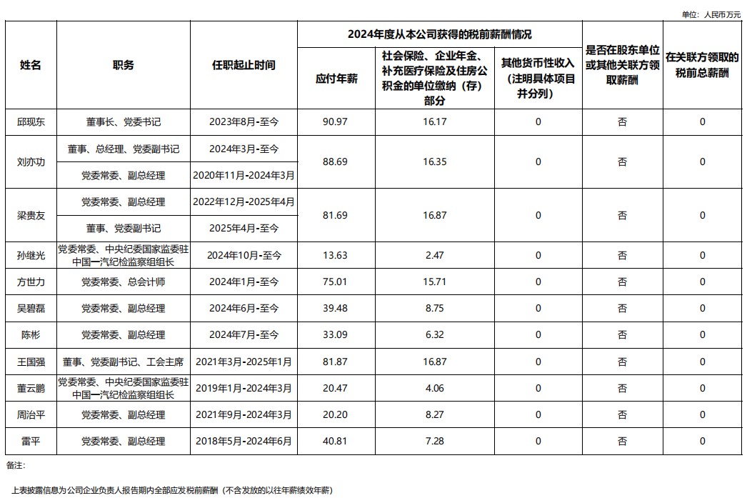 中國第一汽車集團有限公司企業(yè)負責(zé)人2024年度薪酬情況