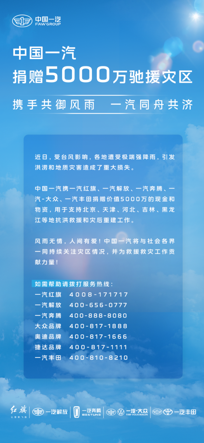 △中國(guó)一汽攜分子公司捐贈(zèng)款物5000萬元現(xiàn)金及物資,支持抗洪救災(zāi)及災(zāi)后重建