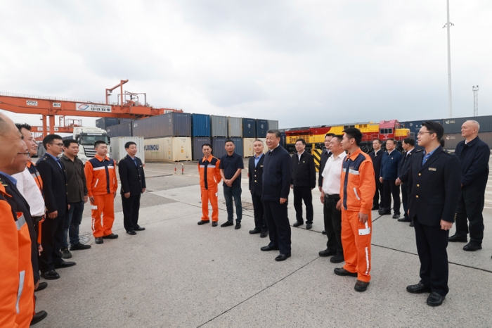 4月22日至24日,中共中央總書(shū)記、國(guó)家主席、中央軍委主席習(xí)近平在重慶考察。這是22日下午,習(xí)近平在重慶國(guó)際物流樞紐園區(qū)重慶鐵路集裝箱中心站,同貨車(chē)司機(jī)、列車(chē)司機(jī)、裝卸工人、場(chǎng)站管理人員等親切交流。