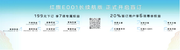 紅旗E001將于今年11月正式上市,目前,長(zhǎng)續(xù)航版已開(kāi)啟盲訂,199元下訂即可享受7項(xiàng)權(quán)益,包括30000元升級(jí)包、首任車主終身質(zhì)保(含三電)、終身免費(fèi)保養(yǎng)、救援、取送服務(wù)等,排名前列20%的盲訂客戶還將擁有更多尊崇權(quán)益。